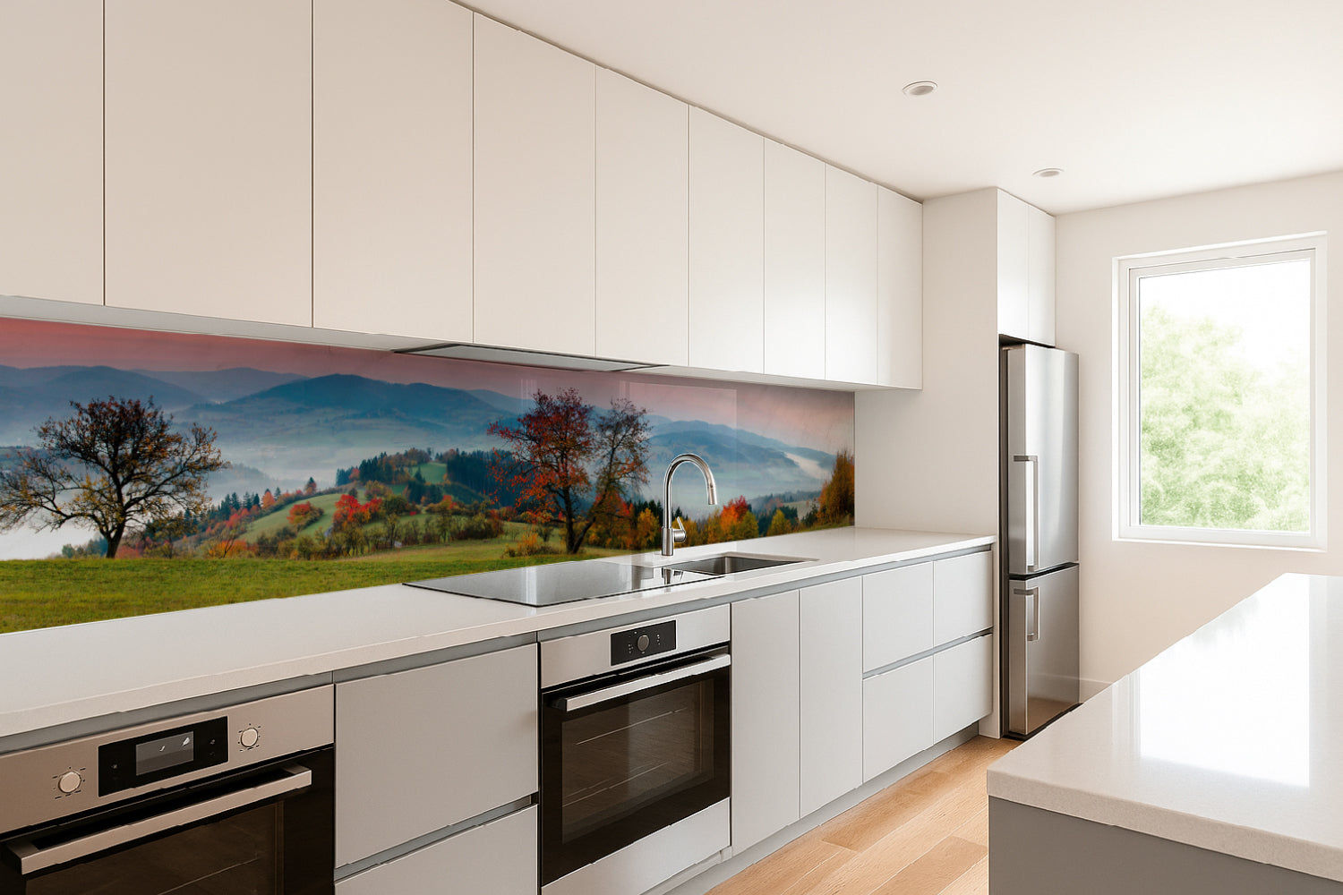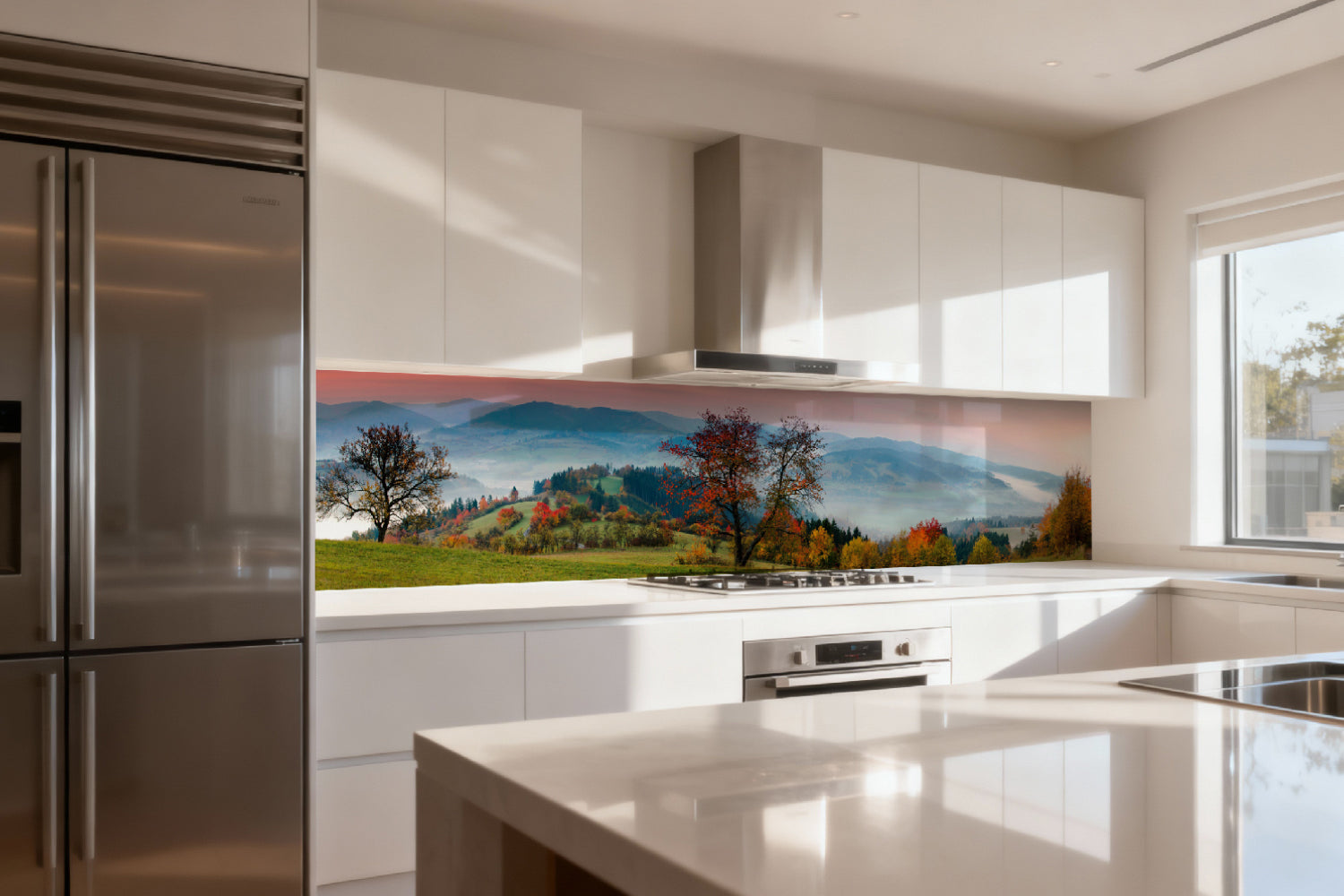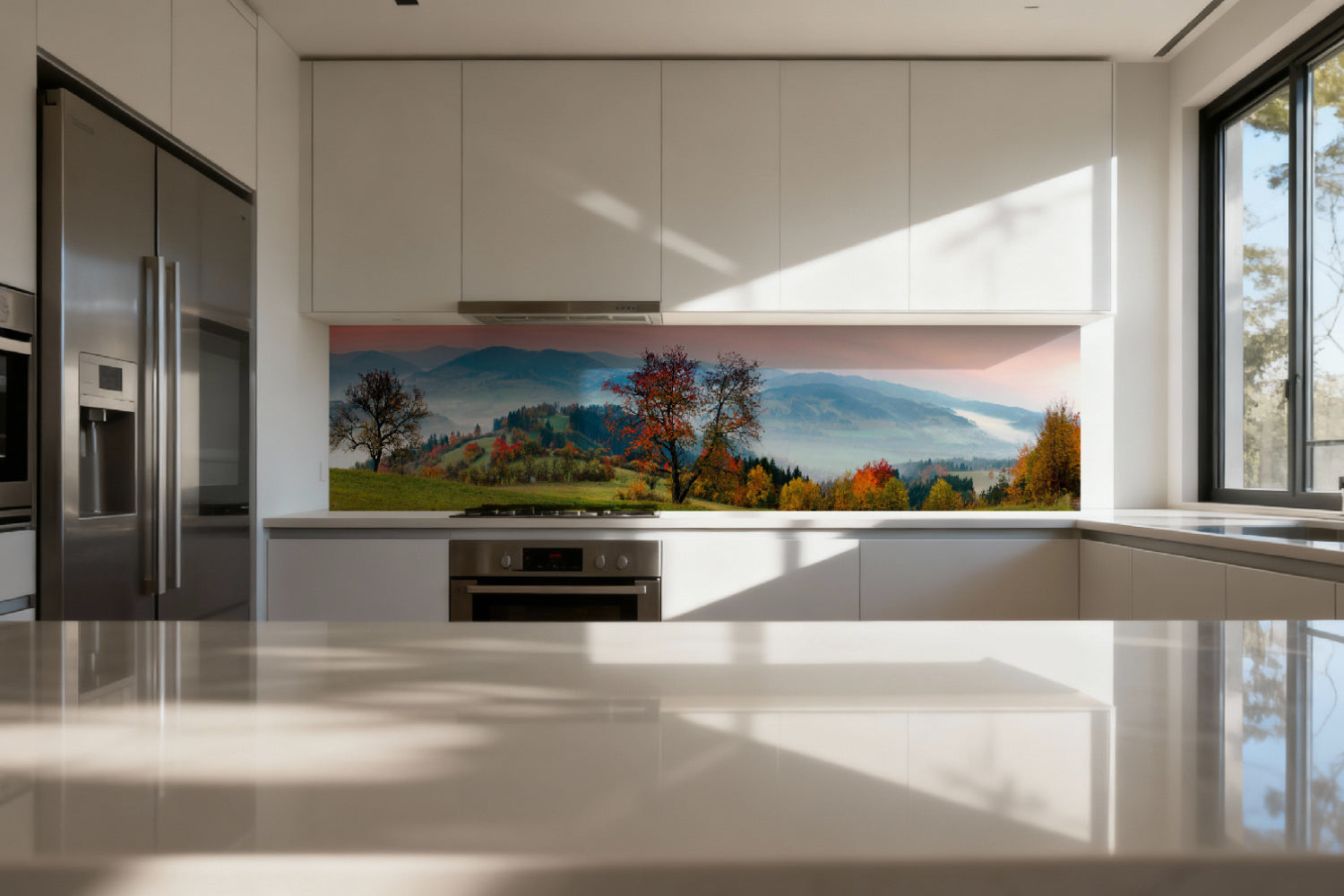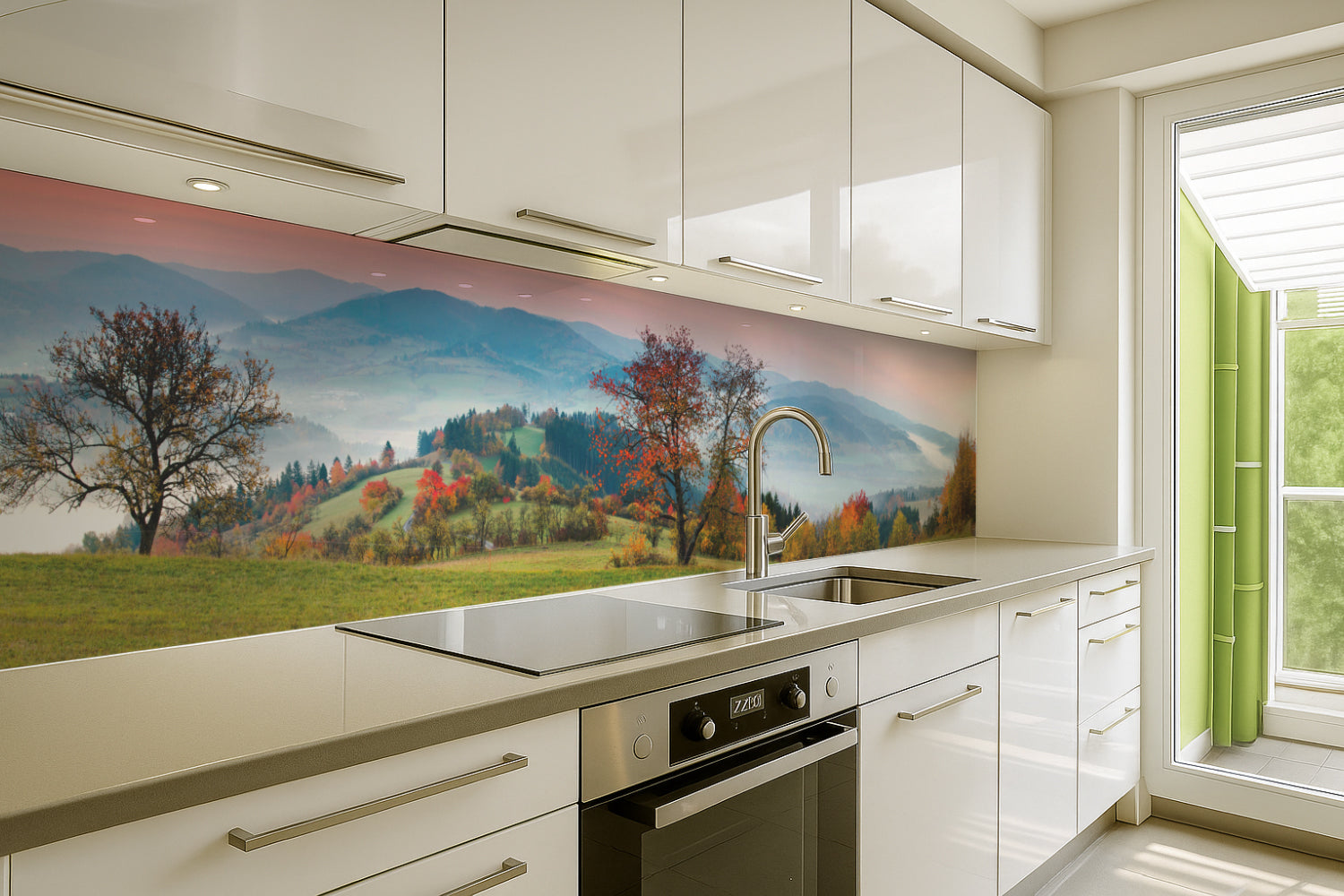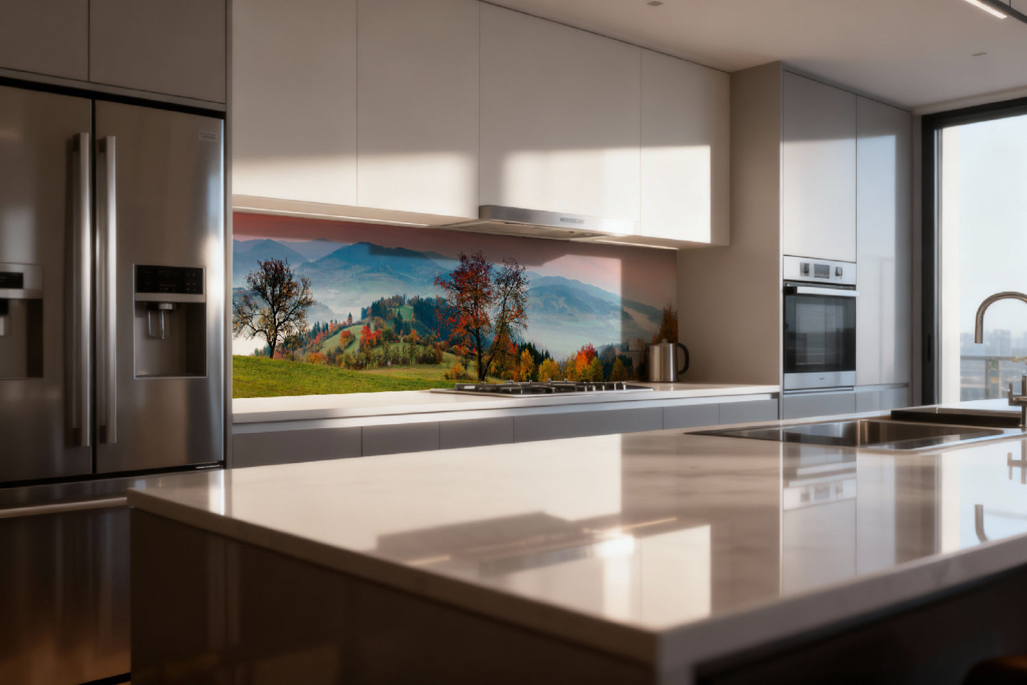 Die glänzende Variante überzeugt mit intensiver Strahlkraft und einem beeindruckenden Tiefeneffekt. Farben und Motive wirken kräftiger, lebendiger und besonders detailreich. Durch die hochglänzende Oberfläche entsteht ein edler Glanz, der Licht reflektiert und dem Raum zusätzliche Helligkeit sowie ein luxuriöses Ambiente verleiht. Eine glänzende Rückwand eignet sich ideal, wenn Sie einen modernen, repräsentativen Look mit besonderer Ausdrucksstärke erzielen möchten.