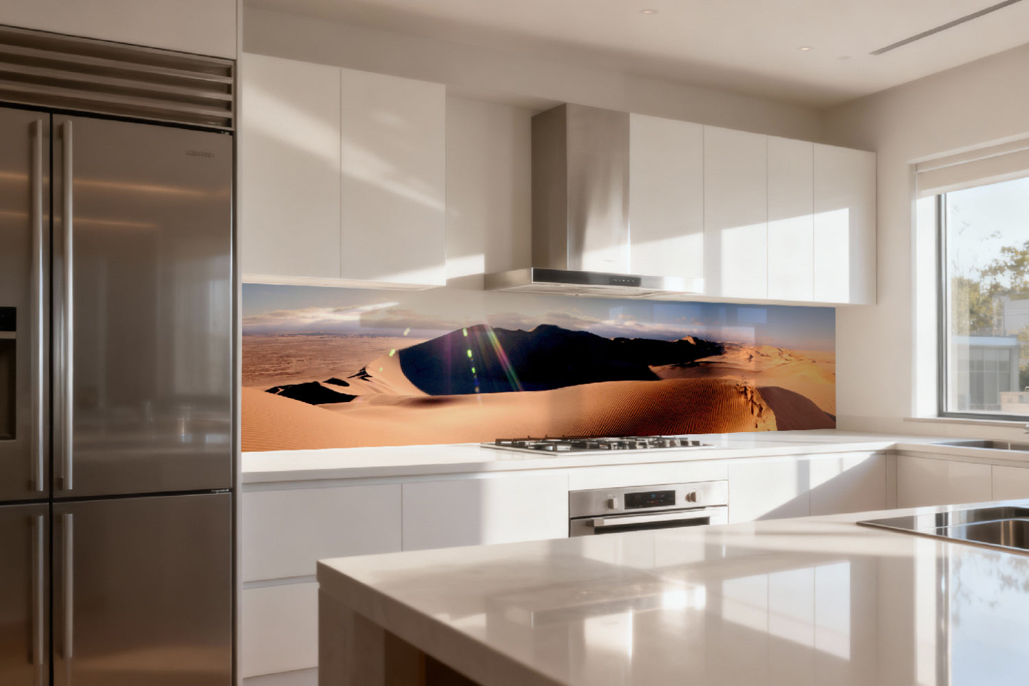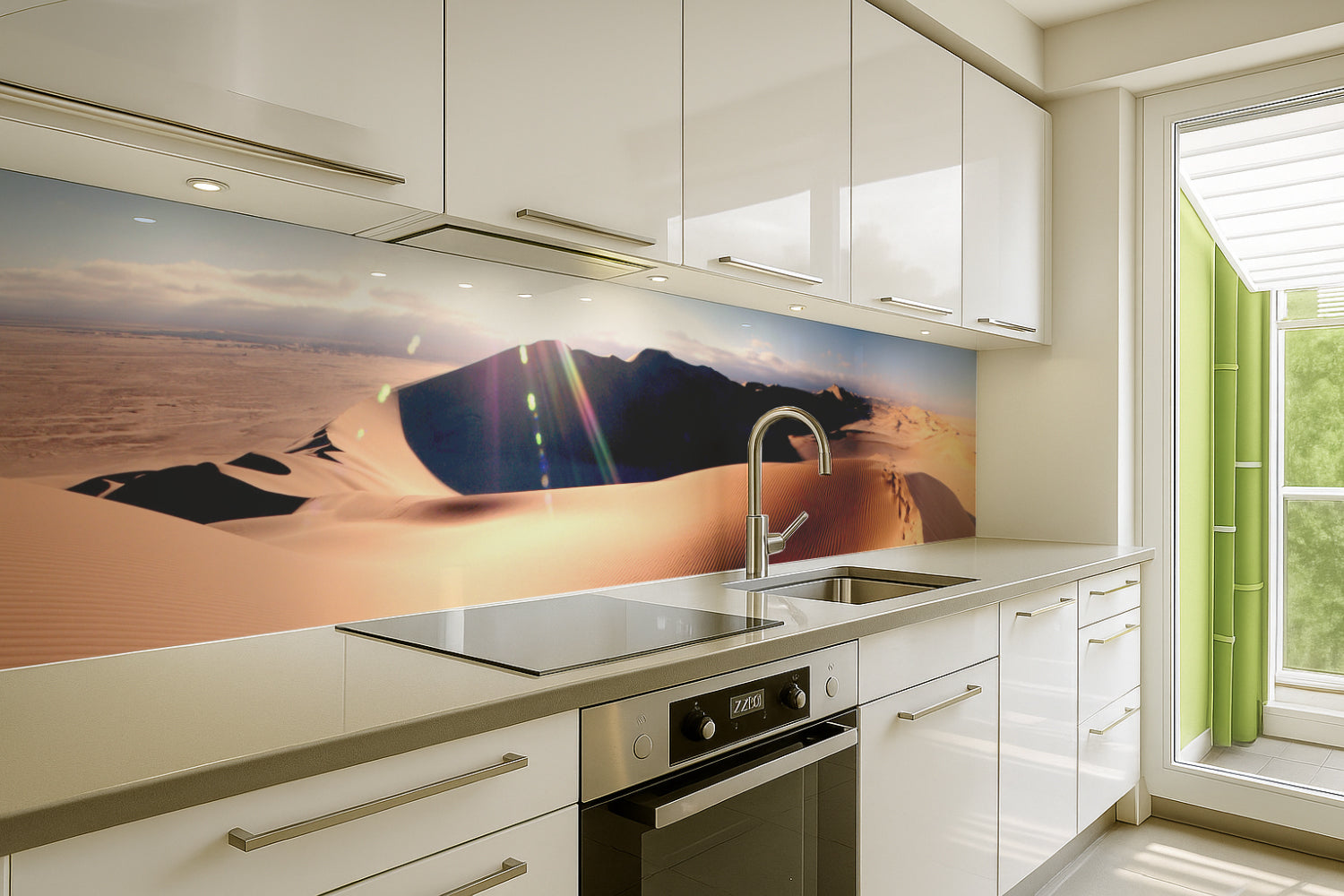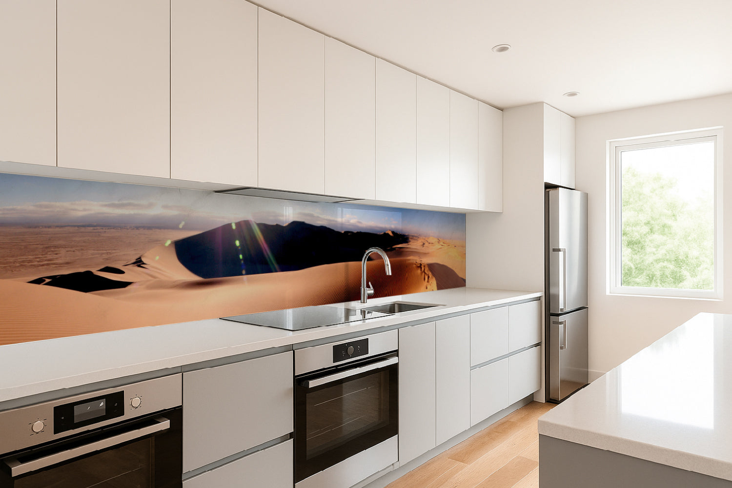 Die glänzende Variante überzeugt mit intensiver Strahlkraft und einem beeindruckenden Tiefeneffekt. Farben und Motive wirken kräftiger, lebendiger und besonders detailreich. Durch die hochglänzende Oberfläche entsteht ein edler Glanz, der Licht reflektiert und dem Raum zusätzliche Helligkeit sowie ein luxuriöses Ambiente verleiht. Eine glänzende Rückwand eignet sich ideal, wenn Sie einen modernen, repräsentativen Look mit besonderer Ausdrucksstärke erzielen möchten.