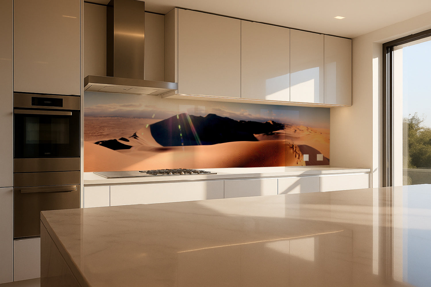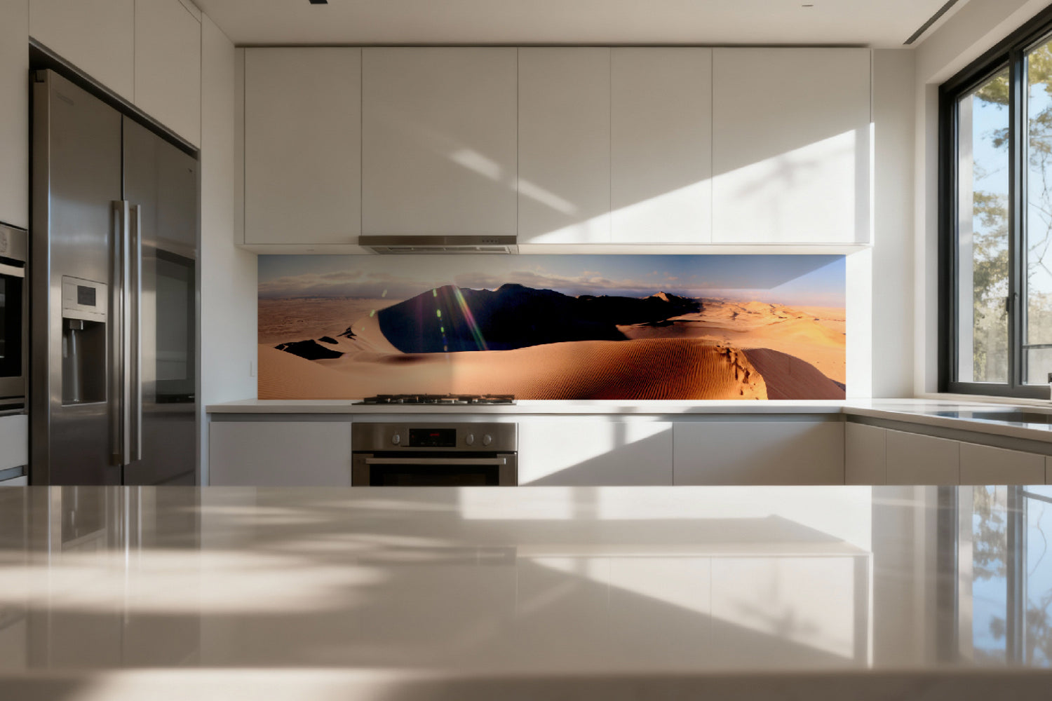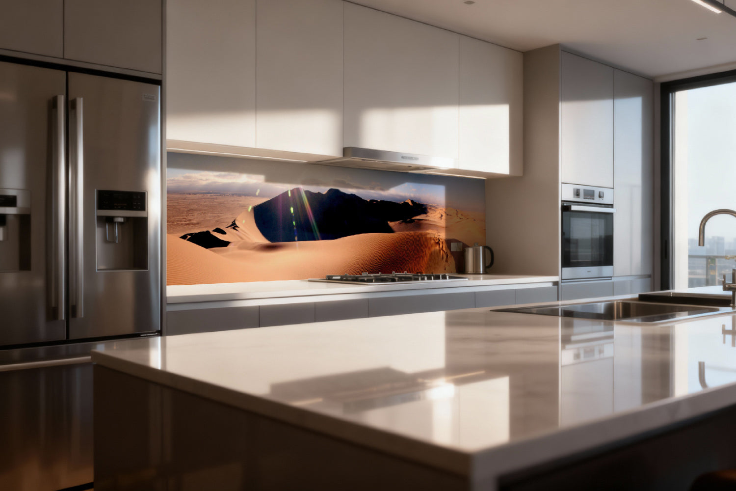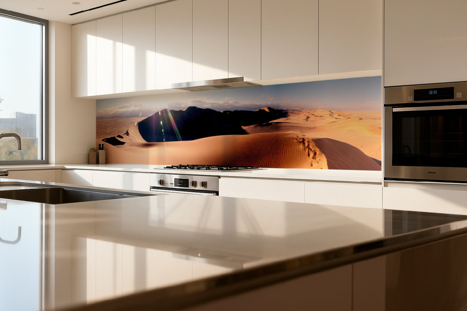 Die glänzende Variante überzeugt mit intensiver Strahlkraft und einem beeindruckenden Tiefeneffekt. Farben und Motive wirken kräftiger, lebendiger und besonders detailreich. Durch die hochglänzende Oberfläche entsteht ein edler Glanz, der Licht reflektiert und dem Raum zusätzliche Helligkeit sowie ein luxuriöses Ambiente verleiht. Eine glänzende Rückwand eignet sich ideal, wenn Sie einen modernen, repräsentativen Look mit besonderer Ausdrucksstärke erzielen möchten.