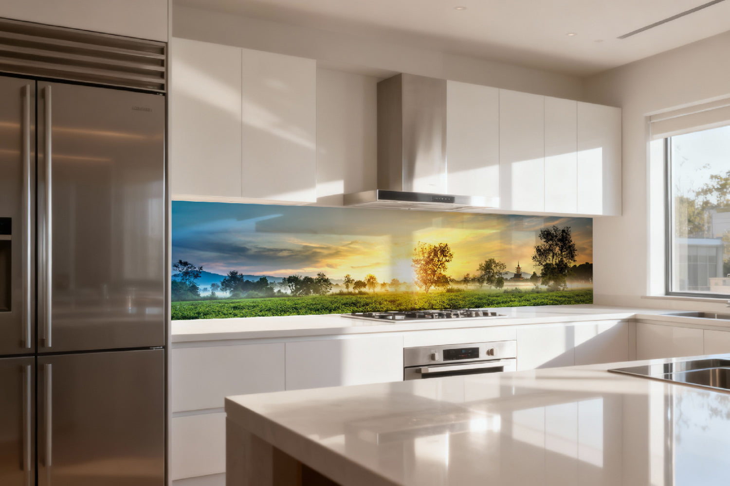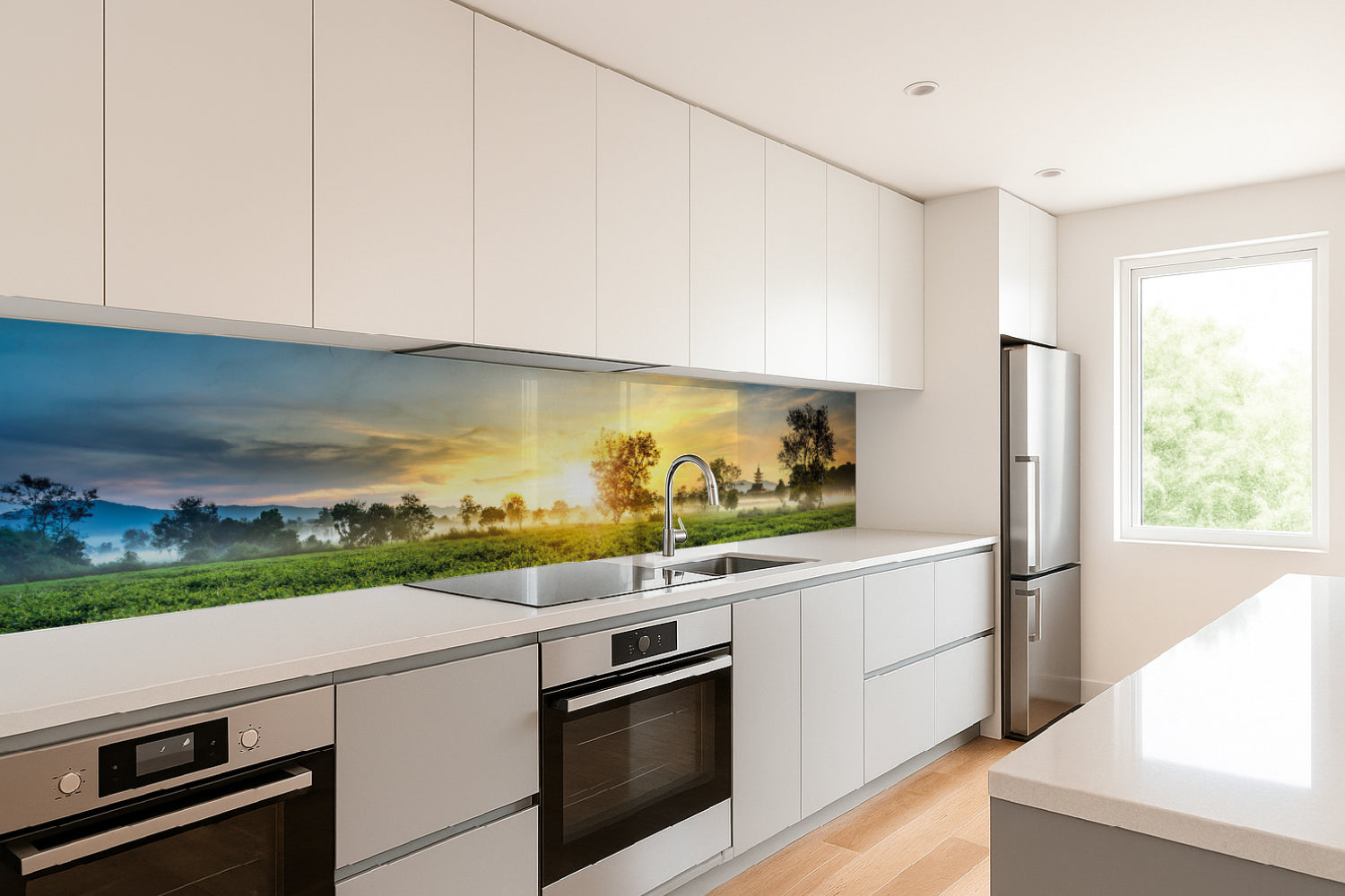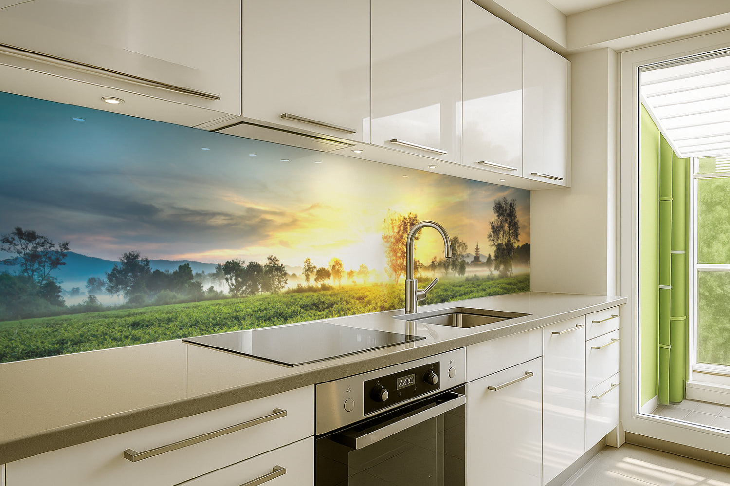 Die glänzende Variante überzeugt mit intensiver Strahlkraft und einem beeindruckenden Tiefeneffekt. Farben und Motive wirken kräftiger, lebendiger und besonders detailreich. Durch die hochglänzende Oberfläche entsteht ein edler Glanz, der Licht reflektiert und dem Raum zusätzliche Helligkeit sowie ein luxuriöses Ambiente verleiht. Eine glänzende Rückwand eignet sich ideal, wenn Sie einen modernen, repräsentativen Look mit besonderer Ausdrucksstärke erzielen möchten.