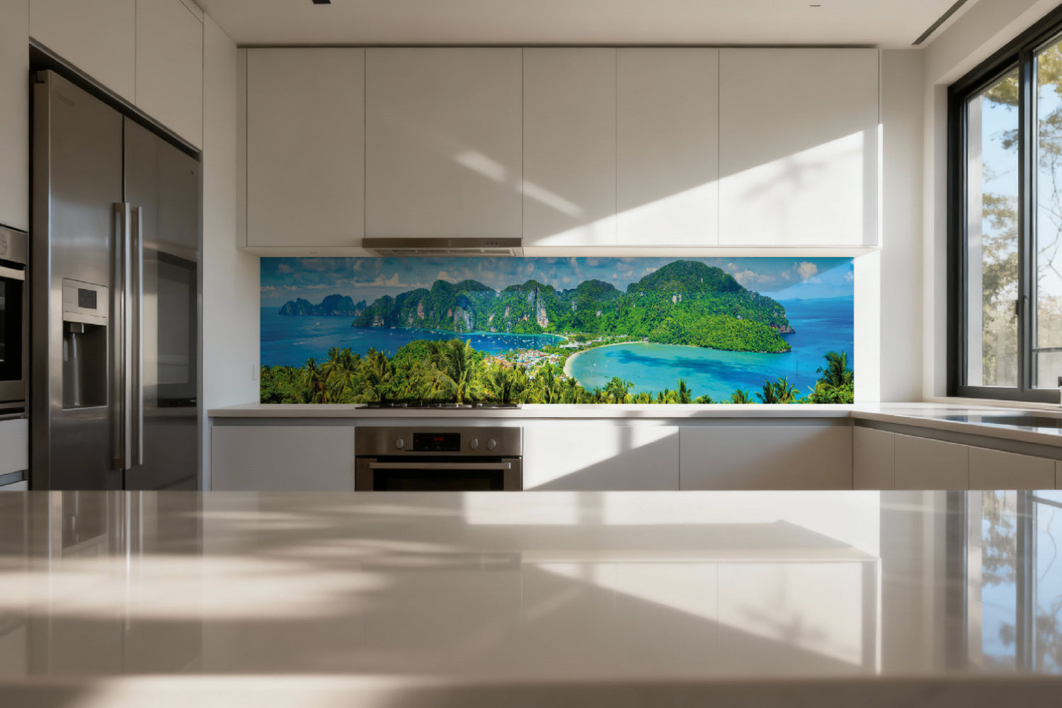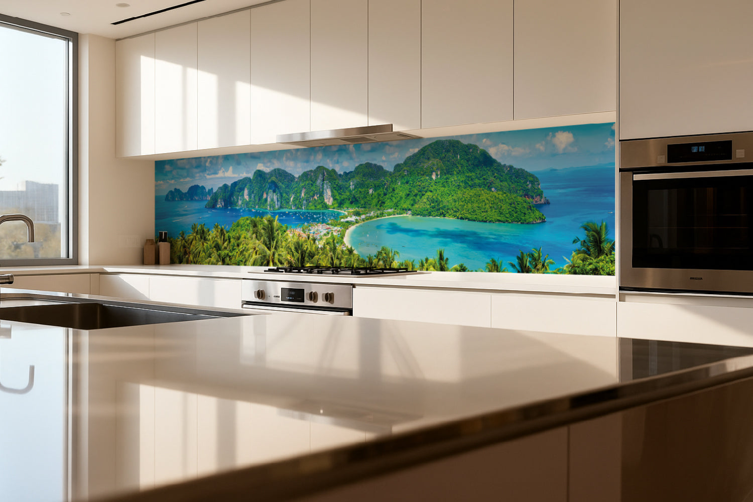 Die glänzende Variante überzeugt mit intensiver Strahlkraft und einem beeindruckenden Tiefeneffekt. Farben und Motive wirken kräftiger, lebendiger und besonders detailreich. Durch die hochglänzende Oberfläche entsteht ein edler Glanz, der Licht reflektiert und dem Raum zusätzliche Helligkeit sowie ein luxuriöses Ambiente verleiht. Eine glänzende Rückwand eignet sich ideal, wenn Sie einen modernen, repräsentativen Look mit besonderer Ausdrucksstärke erzielen möchten.
