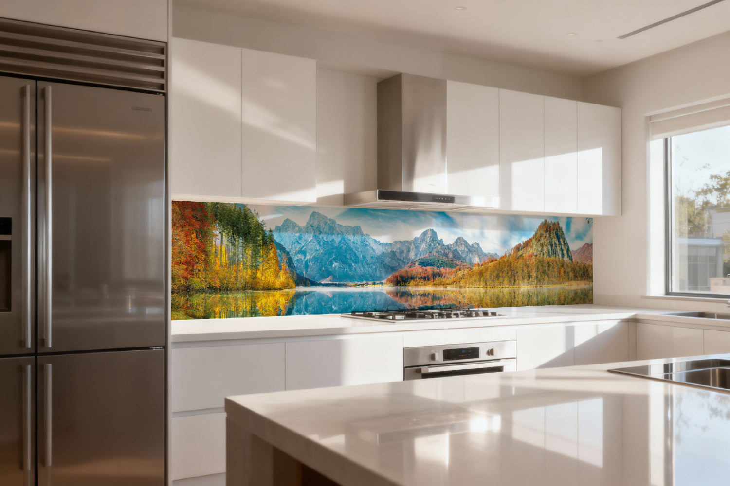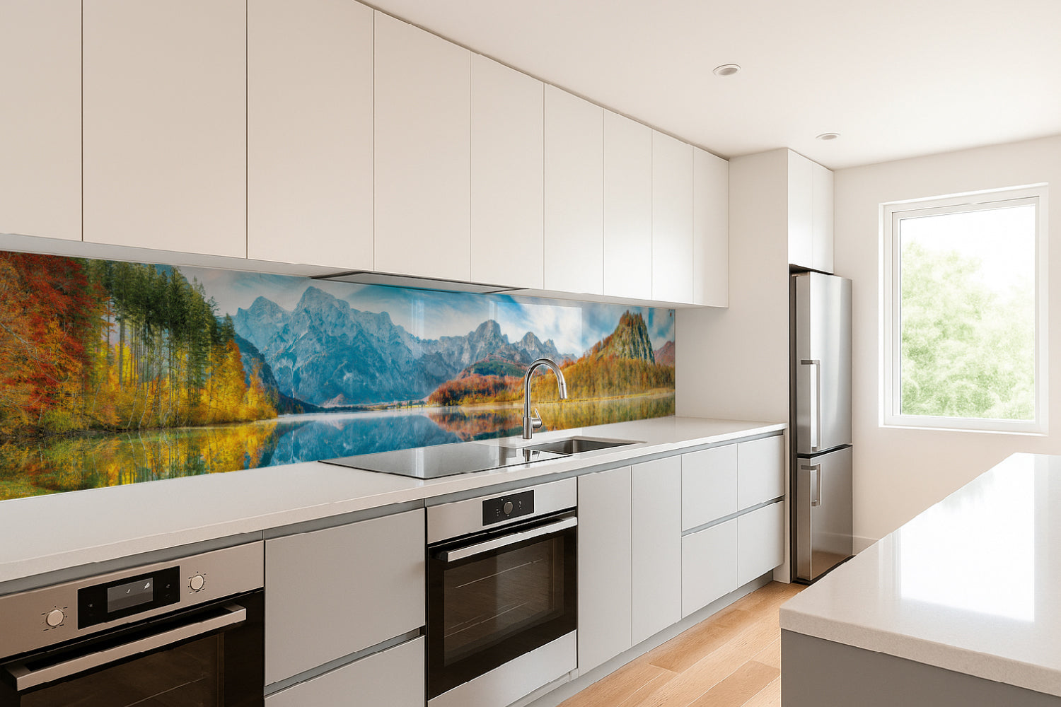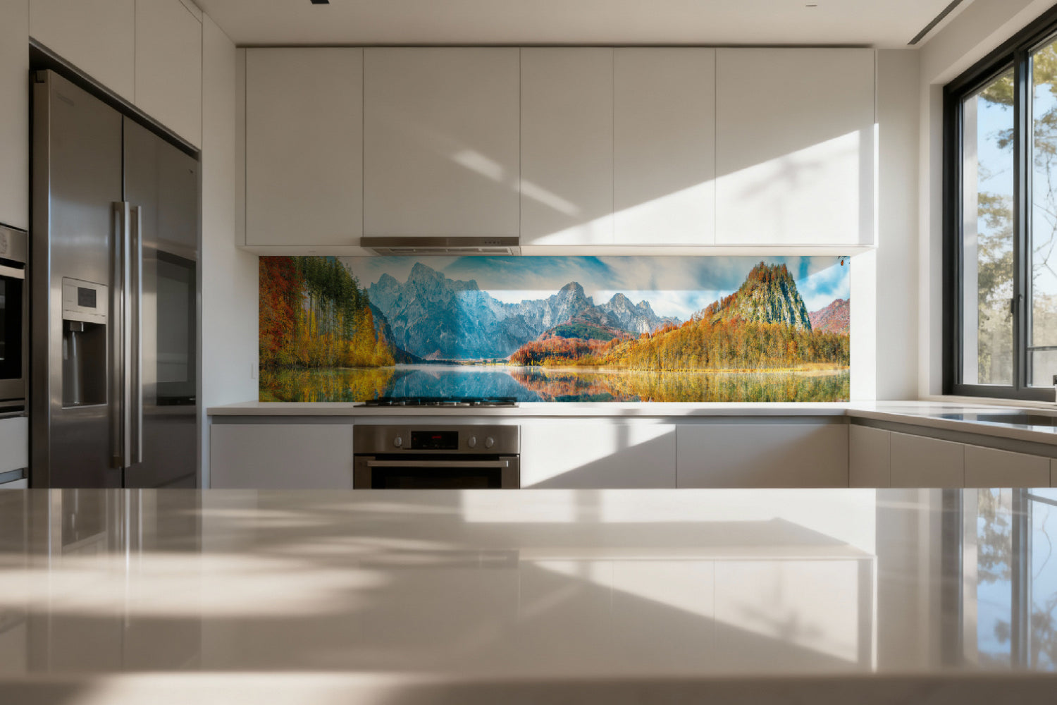 Die glänzende Variante überzeugt mit intensiver Strahlkraft und einem beeindruckenden Tiefeneffekt. Farben und Motive wirken kräftiger, lebendiger und besonders detailreich. Durch die hochglänzende Oberfläche entsteht ein edler Glanz, der Licht reflektiert und dem Raum zusätzliche Helligkeit sowie ein luxuriöses Ambiente verleiht. Eine glänzende Rückwand eignet sich ideal, wenn Sie einen modernen, repräsentativen Look mit besonderer Ausdrucksstärke erzielen möchten.
