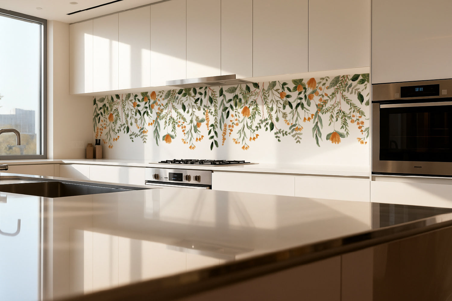 Küchenrückwand Blätter und Blüten Aquarellstil