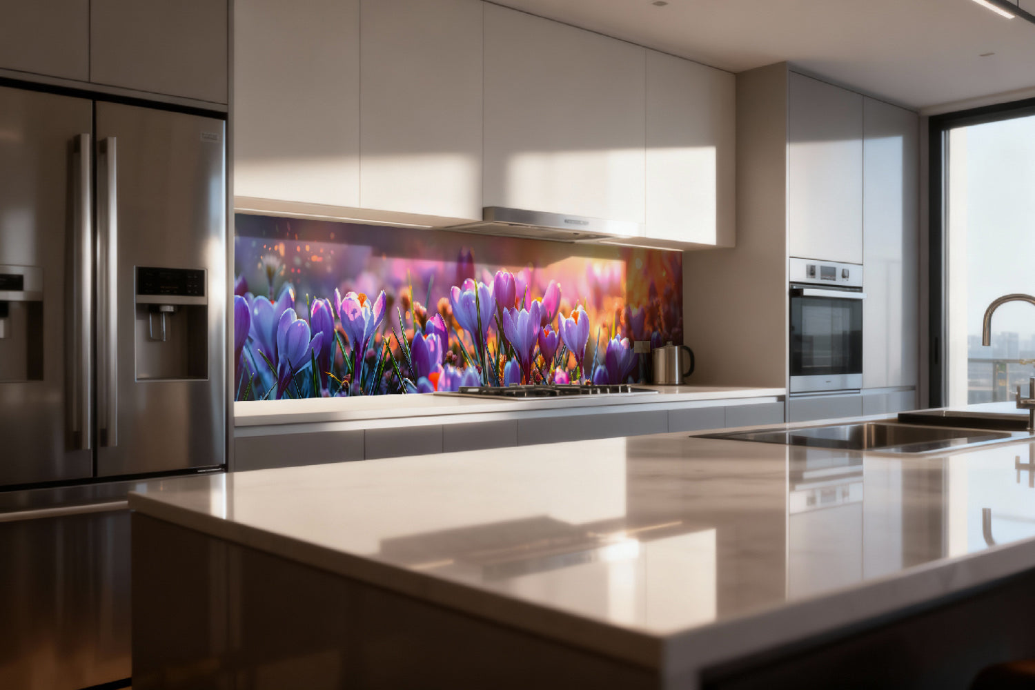 Die glänzende Variante überzeugt mit intensiver Strahlkraft und einem beeindruckenden Tiefeneffekt. Farben und Motive wirken kräftiger, lebendiger und besonders detailreich. Durch die hochglänzende Oberfläche entsteht ein edler Glanz, der Licht reflektiert und dem Raum zusätzliche Helligkeit sowie ein luxuriöses Ambiente verleiht. Eine glänzende Rückwand eignet sich ideal, wenn Sie einen modernen, repräsentativen Look mit besonderer Ausdrucksstärke erzielen möchten.