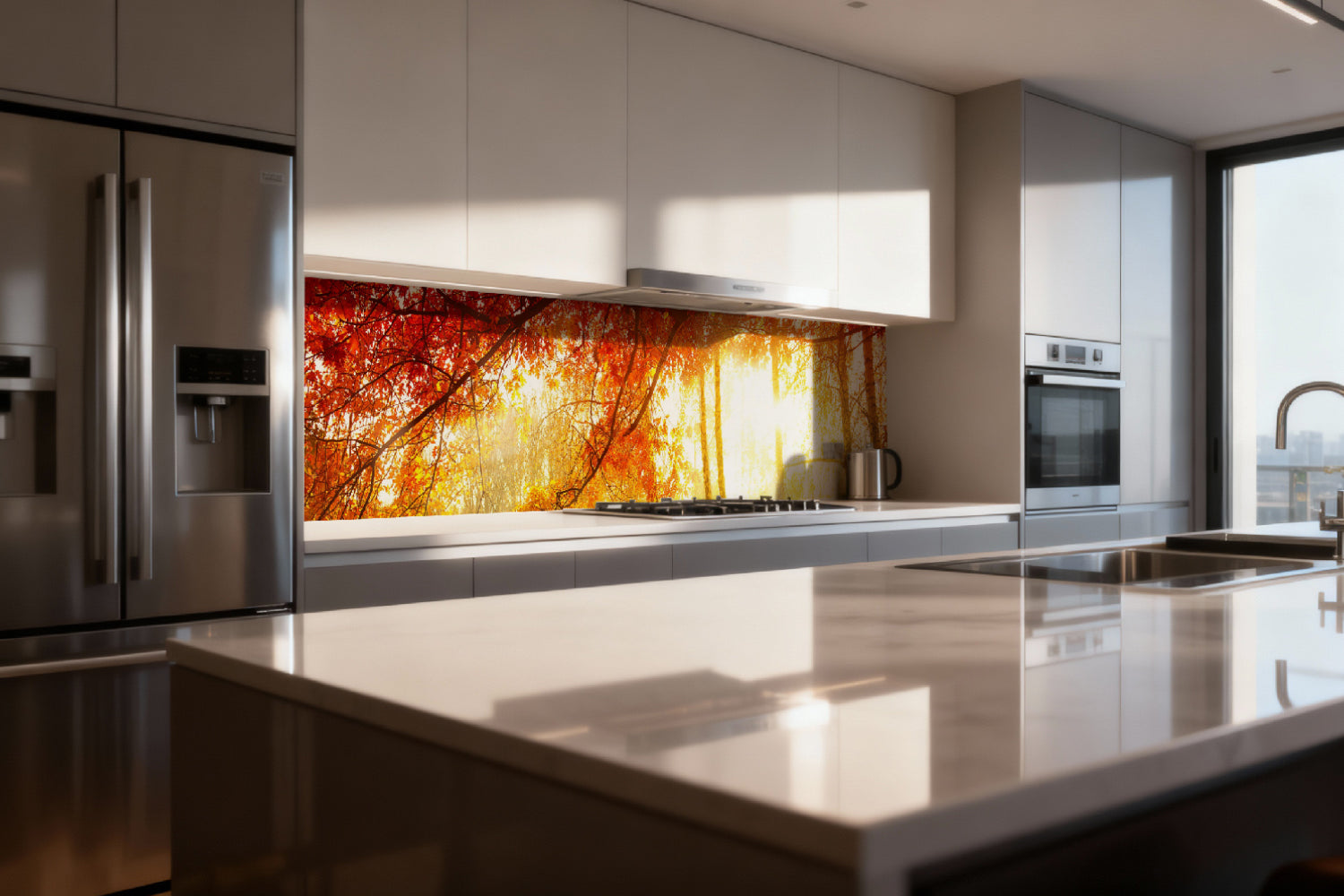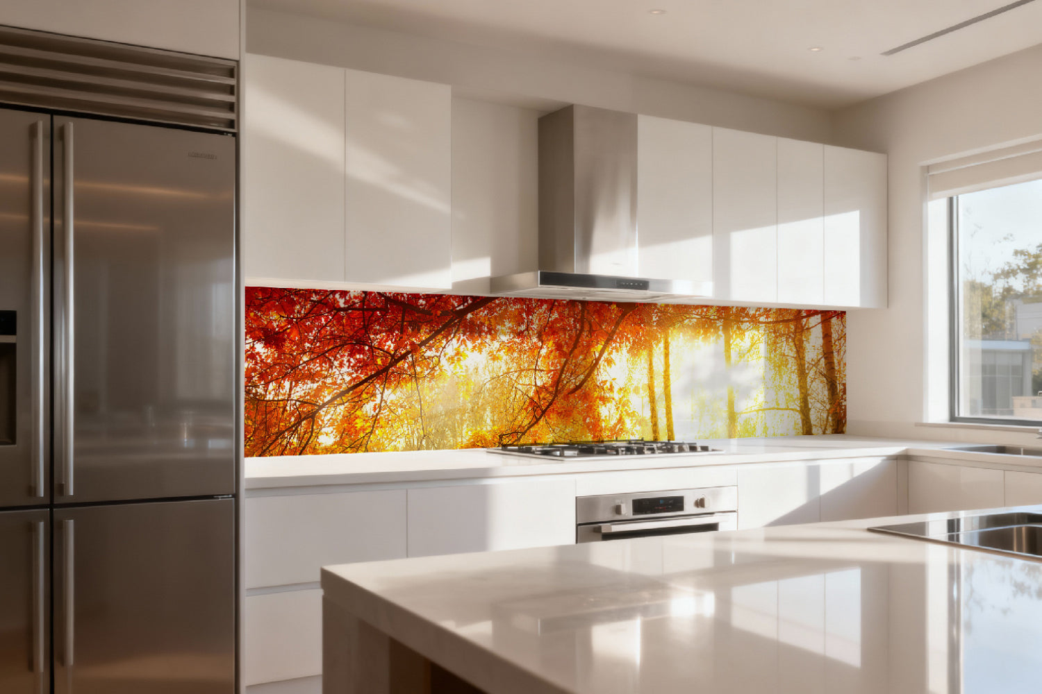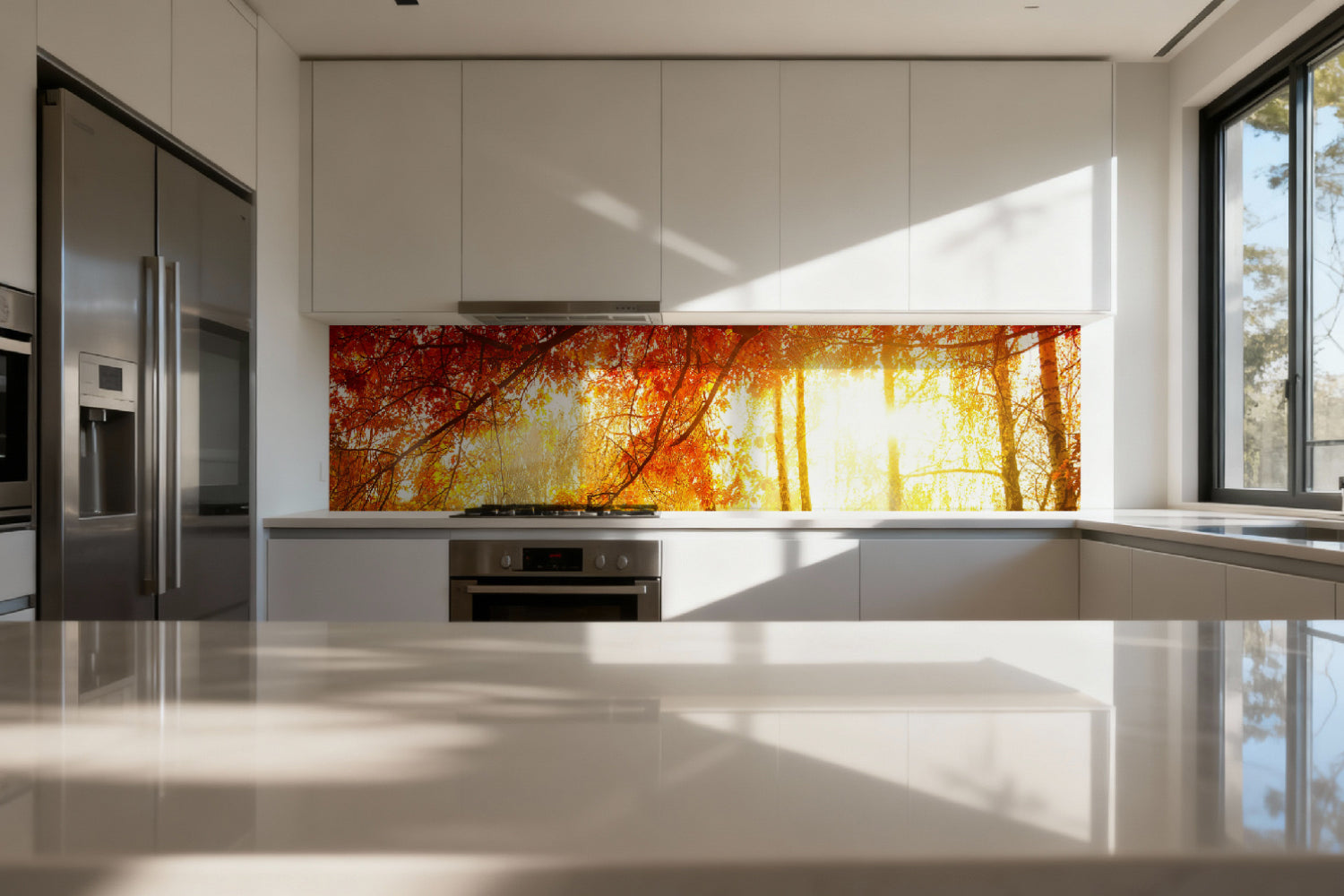 Die glänzende Variante überzeugt mit intensiver Strahlkraft und einem beeindruckenden Tiefeneffekt. Farben und Motive wirken kräftiger, lebendiger und besonders detailreich. Durch die hochglänzende Oberfläche entsteht ein edler Glanz, der Licht reflektiert und dem Raum zusätzliche Helligkeit sowie ein luxuriöses Ambiente verleiht. Eine glänzende Rückwand eignet sich ideal, wenn Sie einen modernen, repräsentativen Look mit besonderer Ausdrucksstärke erzielen möchten.