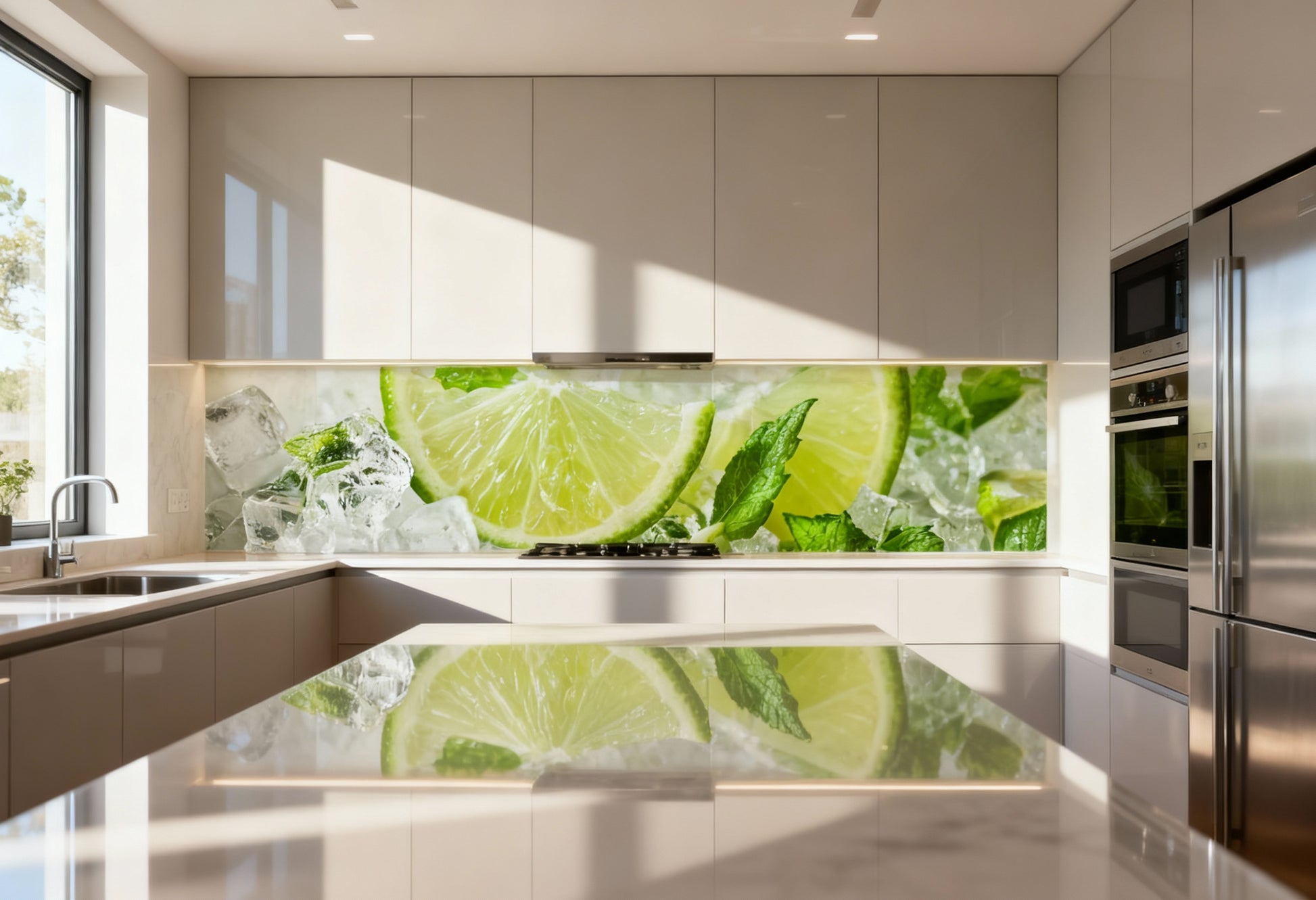 Die glänzende Variante überzeugt mit intensiver Strahlkraft und einem beeindruckenden Tiefeneffekt. Farben und Motive wirken kräftiger, lebendiger und besonders detailreich. Durch die hochglänzende Oberfläche entsteht ein edler Glanz, der Licht reflektiert und dem Raum zusätzliche Helligkeit sowie ein luxuriöses Ambiente verleiht. Eine glänzende Rückwand eignet sich ideal, wenn Sie einen modernen, repräsentativen Look mit besonderer Ausdrucksstärke erzielen möchten.